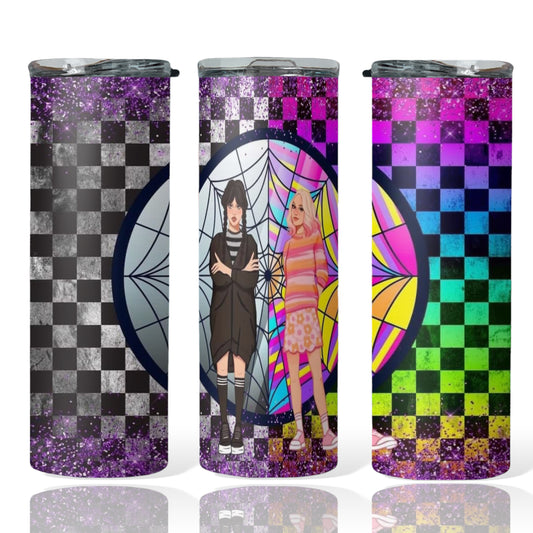 Wednesday Addams And Enid Sinclair Spider Web Purple Checkered Board Sublimation Tumbler