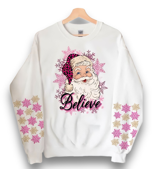 Christmas Believe In Santa Pink Christmas Snow Flake Santa Claus Fleece Sweatshirt| Christmas Sweater