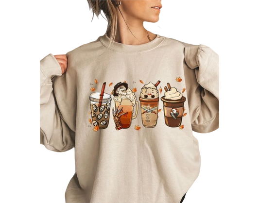 Horror Movie Characters Coffee Latte Distressed Bleached Fleece Sweatshirt| Halloween Spooky Bleached | Chucky Jason Freddy Pennywise|