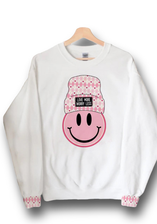 Smiley Face With Beanie Love More Worry Less Valentines Day Fleece Sweatshirt| Sweater