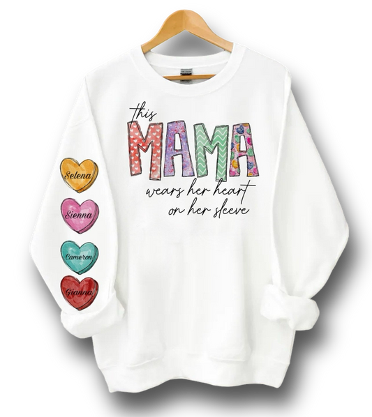 This Mama Wears Her Heart On Her Sleeve Personalized Valentine’s Day Mother’ Day Heart Candy Fleece Sweatshirt|